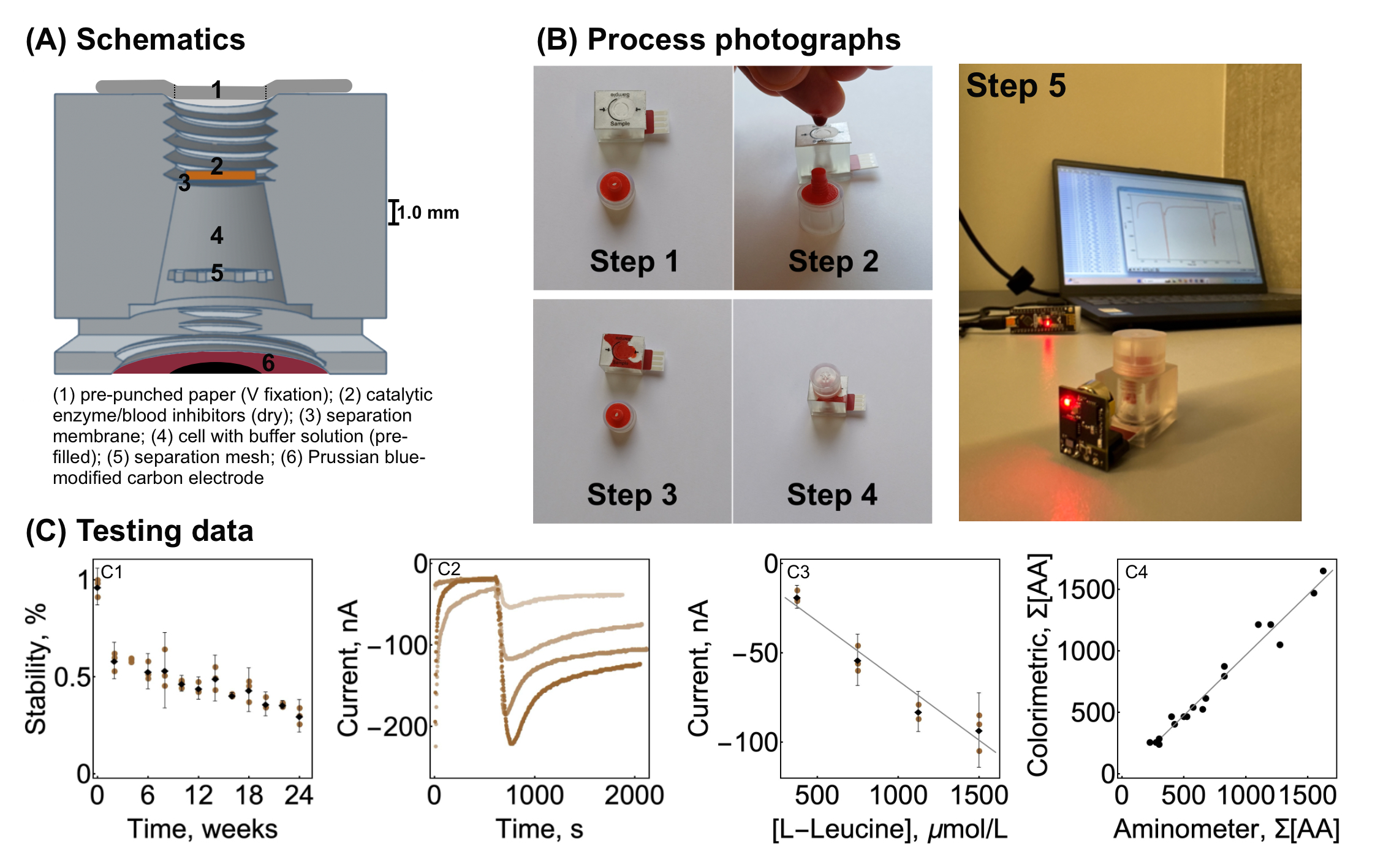 Figure 2. A) Aminometer schematics – cross-section. (B) Process summary photographs involving finger prick sample placement (Step 1-4) and measurement (Step 5). (C) Testing data. C1 – Enzyme catalysts stability over 24 weeks. C2 – Current development curves for pre- calibration batch (from top to bottom: 375, 750, 1125 and 1500 μmol/L). C3 – Pre-calibration curve for concentration estimation. C4 – Validation data with model samples versus alternative colorimetric method.