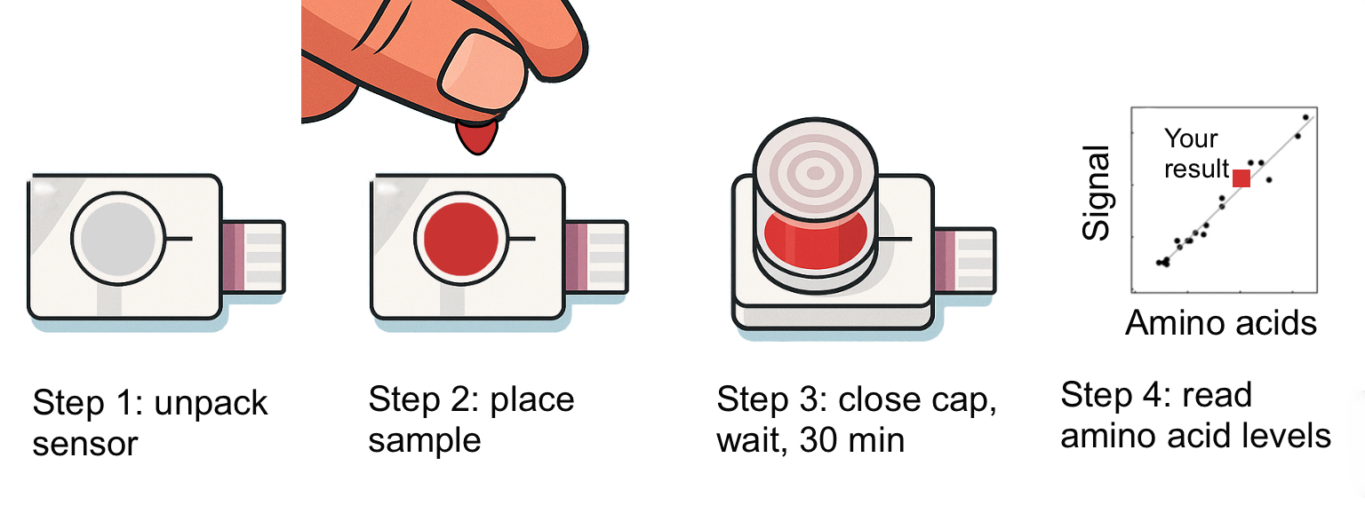 The total pool of blood’s circulating L-amino acids (ΣAA) is an under-measured biomarker integrating muscle protein turnover, nutritional status or metabolic disorders. Despite its clinical relevance, current methods for quantifying ΣAA, including colorimetry and chromatography, are laboratory-bound, slow, and unsuitable for decentralized or extreme environments such as space missions. Contracted by European Space Agency, we are developing a portable, lightweight device – Aminometer – for rapid, calibration-free, convenient measurement of total L-amino acids (ΣAA) from a single drop of blood.