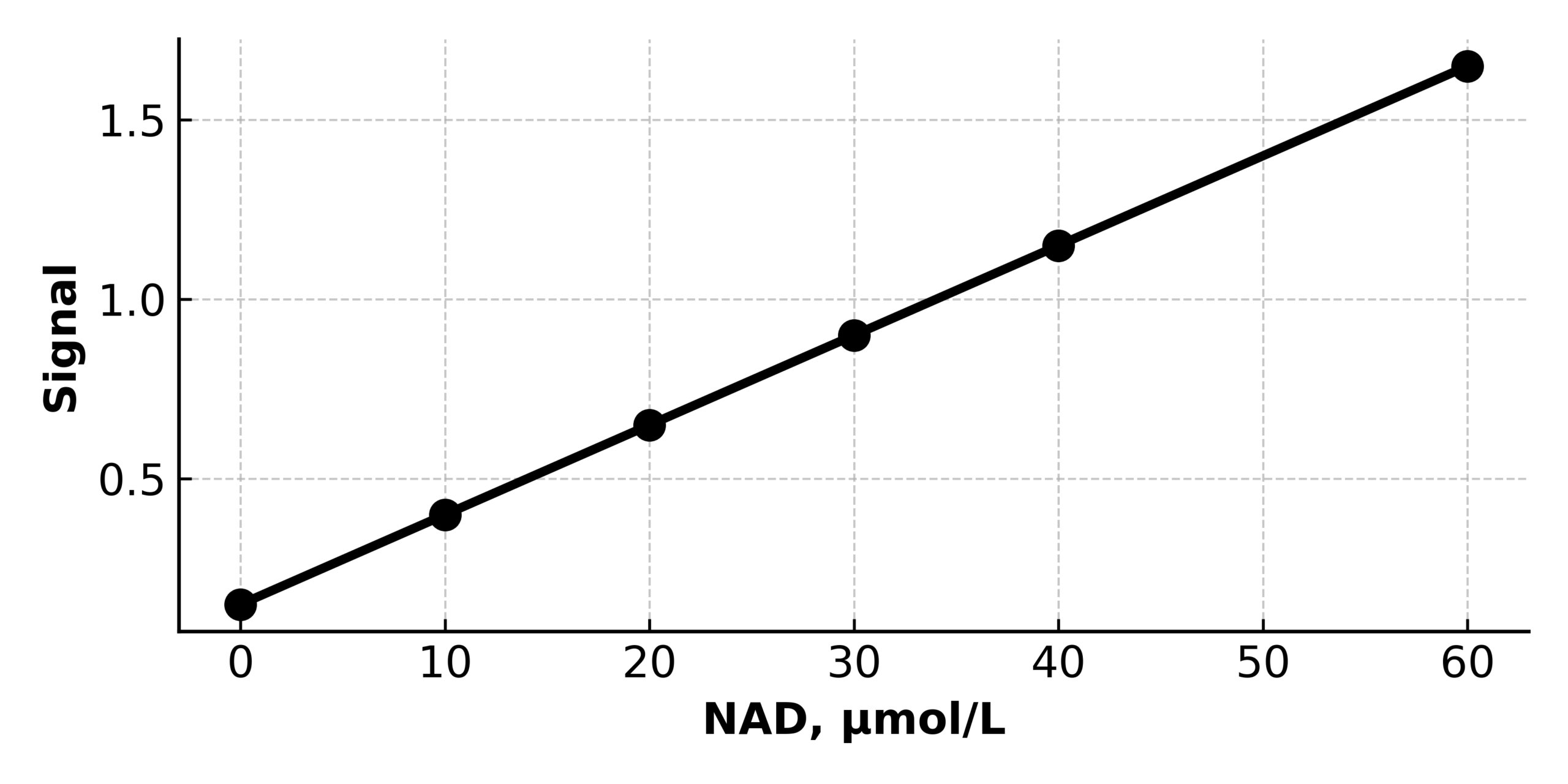 - Method principle – enzymatic cycling assay. Specific enzymes react with NAD and related components to produce a colored dye. The color intensity is proportional to concentration.