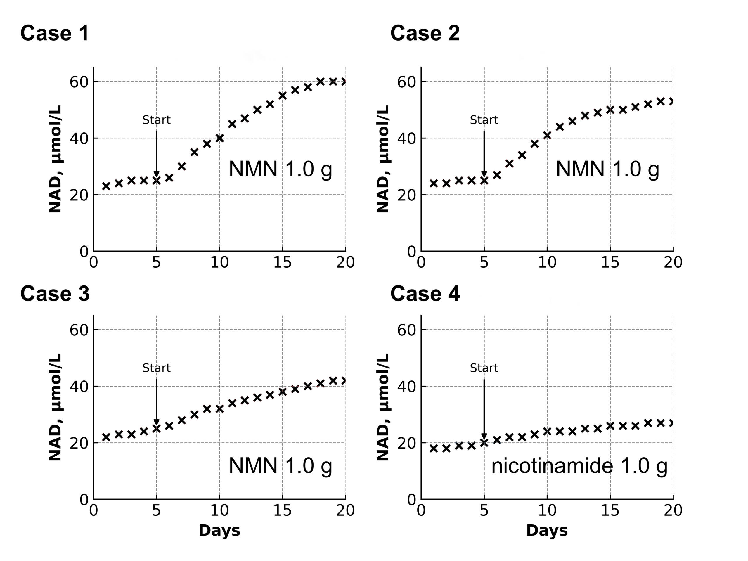 Figure 2. Real world testing data showcasing how supplementation efficiency could be monitored using our NAD testing. Examples of two cases, once customers tested daily before and after supplementation. Cases in blue – customers tested for 5 days to receive blank NAD levels, when started taking NMN. A clear NAD level increase could be seen. Customer who took nicotinamide, did not experience significant NAD level increase.